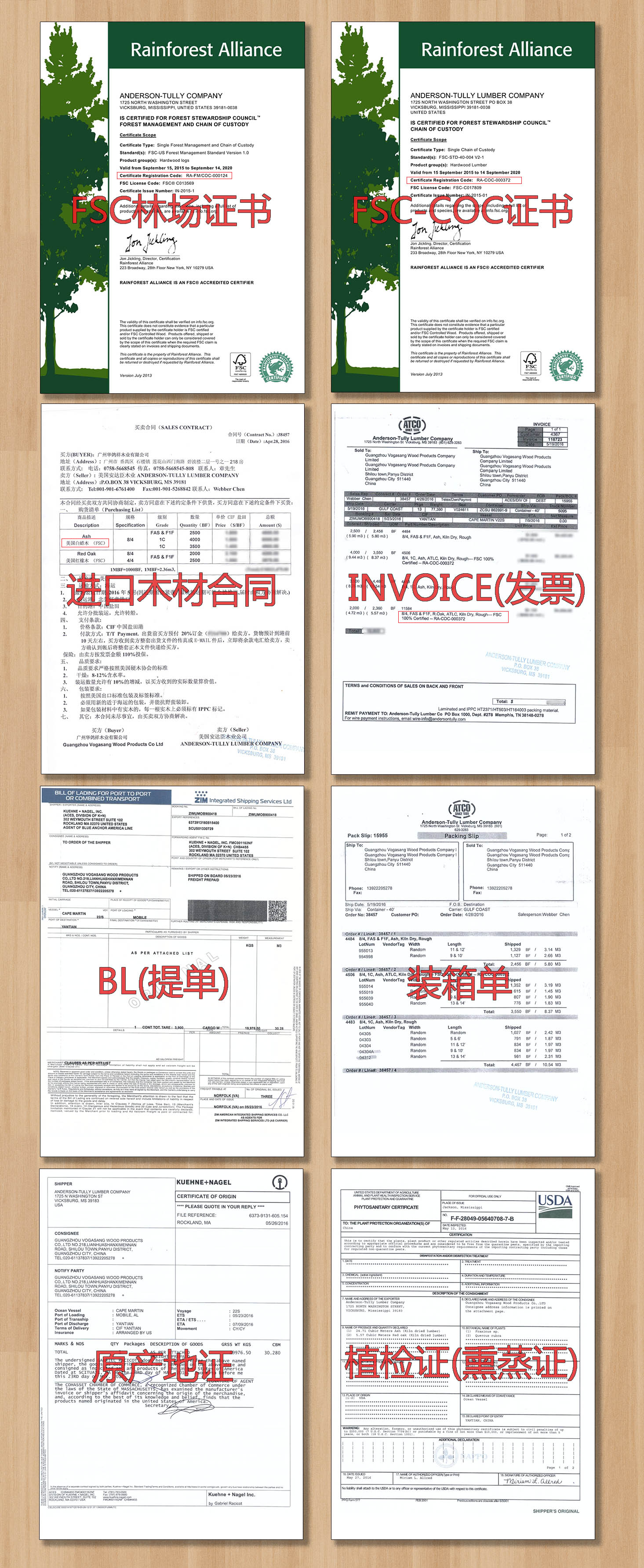 FSC供應(yīng)鏈: FSC林場(FSC-FM證書) —— FSC板材供應(yīng)商(FSC-COC證書、合同、發(fā)票、提單、裝箱單、原產(chǎn)地證、檢疫證) —— 廣州華鴿祥